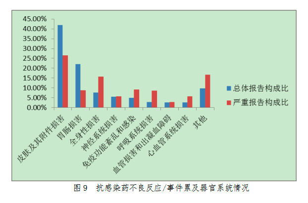 抗感染藥整體藥品不良反應/事件報告中,口服制劑累及器官系統前5位是胃腸損害、皮膚及其附件損害、神經系統損害、肝膽損害和全身性損害;注射劑累及器官系統前5位是皮膚及其附件損害、胃腸損害、全身性損害、免疫功能紊亂和感染、神經系統損害。
